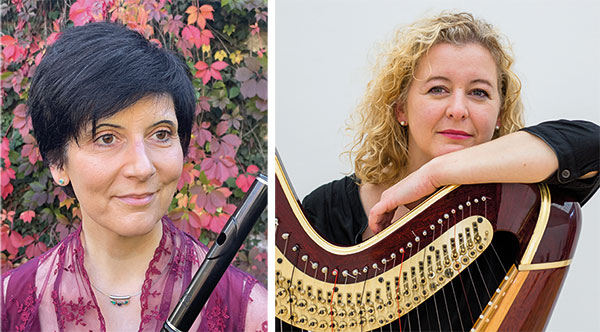 ![]() Flöte und Harfe bilden eine reizvolle Verbindung der instrumentalen Klangfarben. Die Flöte, als das sensibelste der Blasinstrumente, gesellt sich gern zu einem Partner, der sie unterstützt, aber nicht unter Druck setzt. Das ist bei der Harfe der Fall; sie bleibt selbst im größten Klangrausch dezent und umschmeichelt den Klang der Flöte. Allerdings sind Werke für diese Besetzung eher selten. Daher haben die Flötistin Angeles Gomez y Rieser und die Harfenistin Julia Weissbarth in ihrem Programm hauptsächlich auf Bearbeitungen zurückgegriffen. Sie sind sehr verbreitet und beliebt und haben sich im Konzertleben weitestgehend durchgesetzt. Angeles, die ihr Konzertexamen an der Folkwang Hochschule in Essen “Mit Auszeichnung“ abgelegt hat, spielte in der Folge an der Oper Essen und der Philharmonie Westfalen-Gelsenkirchen sowie in Kammermusikensembles wie dem Ensemble Pittoresque und mit Pia Grees, Karin Karle und Guido Heinke. Julia Weissbarth startete ihre Karriere als Musikerin mit mehreren 1. Preisen beim Bundeswettbewerb Jugend musiziert und weiteren Preisen und Stipendien, z. B. von der Kunststiftung Baden-Württemberg. In den folgenden Jahren wurde sie von berühmten Orchestern als Solistin eingeladen, darunter das SWR Sinfonieorchester, die Bamberger Symphoniker und viele andere. Auf internationalen Festivals tritt sie immer wieder auf, darunter die Sommerlichen Musiktage Hitzacker, das Lucerne Festival, das Mozartfest Würzburg und die Tage für Neue Musik Donaueschingen. Internationale Konzertreisen führten sie durch viele europäische Länder und in die USA. Sie ist auch als Pädagogin tätig und unterrichtet an der Musikschule Staufen und in der Schweiz. | ||||||||||||||||||||||||||